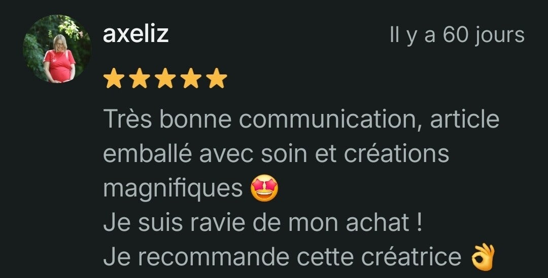 Je suis ravie de savoir que mes créations vous apportent joie et satisfaction. Découvrez les témoignages de mes clients et partagez votre expérience avec LumiLove Bijoux. Votre avis est précieux et m’aide à m’améliorer chaque jour.